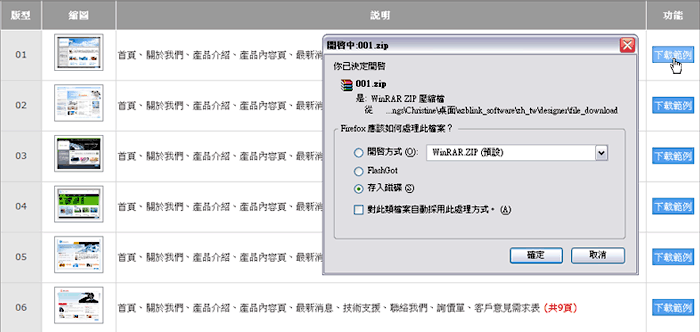 点选主选单中【范例版型下载】选项,选定任一版型,点选对应的【下载范例】按纽,下载该版型的压缩档,下载完成后,解压缩即可浏览档案,档案包含html、psd、CSS及相关图片文件。