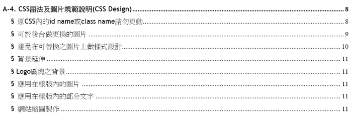开启解压缩后的活页夹,活页夹内包含html、psd、CSS及相关图片文件(可先将此活页夹备份,以对照修改结果),在开始修改CSS及相关图片前,应先仔细阅读设计规范文件中的 A-4 CSS语法及图片规范说明,您所有的相关设计应符合Azblink规范事项,以缩短样版交付后的测试时间,感谢您的配合。 范例图: