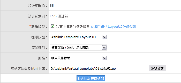 点选主选单中【发送样版完成通知】选项,仔细填写样版相关信息的窗体,勾选我要上传新的样版版型字段后,点选【浏览档案】按纽,上传网站原始档及html(请先压缩成zip档案),按下【发送样版完成通知】按钮,系统将发送通知给 Azblink 技术团队,进行最后测试。测试无误后, Azblink 会将您制作的样版,更新至【样版下载服务】 开放供客户下载,并寄送相关信息至设计师的邮件信箱,设计师可随时上网查看样版下载情形。
