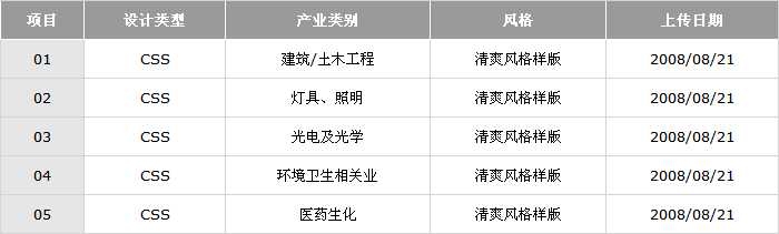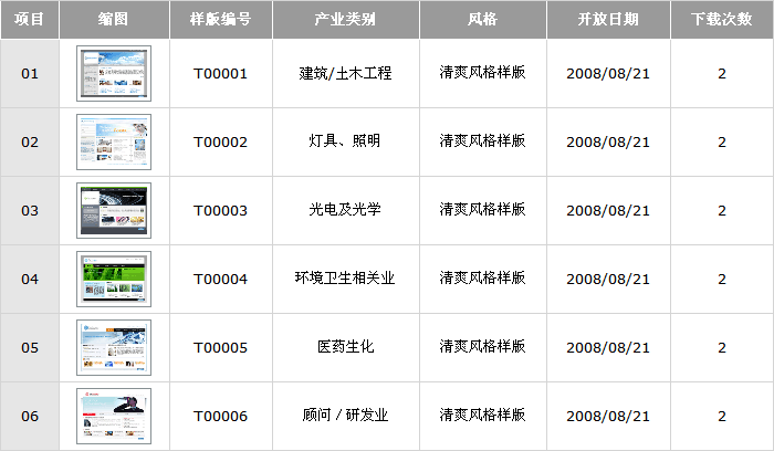 此处可以查看您已经开放下载的网站样版信息包括:样版缩图、样版编号、产业类别、风格、开放日期、下载次数。