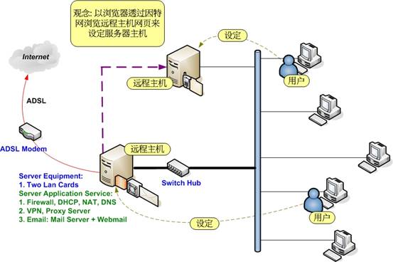 2. 除了一开始当主机未能连上网络时,您需由控制台模式来设置主机外,由于大部分的设置是经由浏览器去浏览 “远程主机” 的网页来完成,所以透过该网页所下达的指令,是在于指挥 “远程的主机” 去完成命令,而非对您浏览器所在的 “机器本身” 下达指令,这与一般个人计算机的操作使用,是针对软件所在机器本身是不同的,请切记这个概念。其大概的观念即如下图所示。