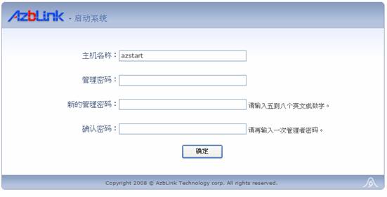 在系统安装完成后,于出现的控制台设置IP画面中,您可选择由原网络之DHCP分派来取得新安装机器的网络IP地址,或您可设置固定的公共/私有IP地址,然后再重新开机。之后,您可以在任何一台PC(若非公共IP地址,请使用连结在与此台新设置主机相同网络中的PC),在Windows浏览器的网址列中输入 http://192.168.1.61:8082/apps/(假设该新机器的网络地址是被分派或是指定为 192.168.1.61)或http://azstart:8082/apps/(系统预设主机名),来进入 AzOS系列所提供的设置管理页面。