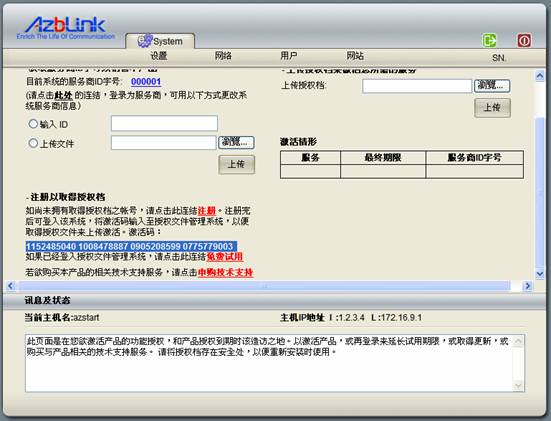 (在System >> 设置 >> 激活 网页中,视需求按下网页中的注册、免费试用或申购技术支持的连结,该连结会带领您到达Azblink.com的网站,在网页中填入必要的信息及选定您需要的产品后,系统会响应并要求您,选择想要的功能并下载授权档案),然后您必须将该授权档案(不需解压缩),在 AzOS系列所提供的 System >> 设置 >> 激活 网页中,上传 授权档案 到新设置的机器上,来激活试用或是已购入的功能。