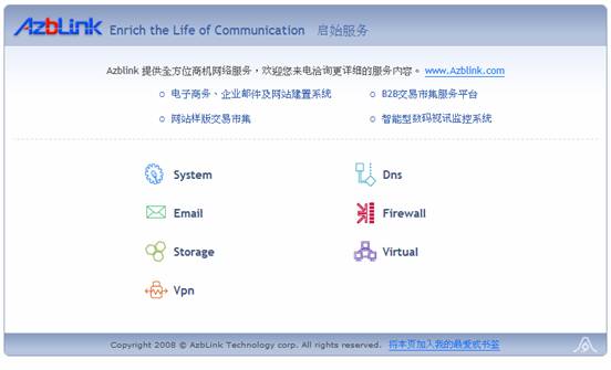 由于是以虚拟主机为主的架构,故一般我们浏览网页所使用的端口80,在此被规划让虚拟主机来使用,而管理端则另辟端口。一开始尚未设置任何网站之前,系统的预设网站将会转往Azblink.com的首页;若欲进入管理页面,请运用端口8082。