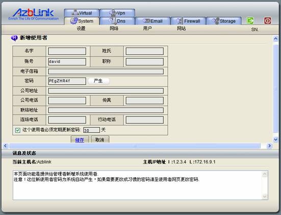一开始您可能有几位用户要使用新设置的服务器,例如收发邮件等,那么您必须在服务器网络相关设置完成后,选择System >> 用户 >> 用户管理 的设置页,来逐一新增用户,您可以同时参阅第五章的 电子邮件 篇章,来设置邮件服务器。在将这两项设置完成后,该被新增的用户,即可以使用如Outlook Express或是本系统所提供的Webmail邮件客户端软件来收发邮件了。