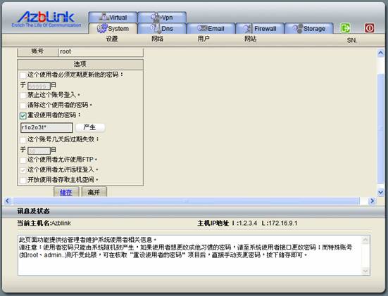 在第一次登入的画面或许您已经有将admin的管理者帐号的密码变更了,但是root却容易让人忽略,因此强烈建议,在设置好网络,欲新增其它用户之前,请务必到 System >> 用户 >> 用户管理 页面点选系统预设用户里的root,勾取“重设用户的密码”项目功能,再手动将root密码变更储存。