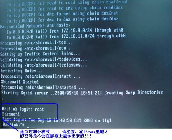 3. 由于系统是使用Linux平台来开发的,而Linux的程序基本上都是在背景下执行服务的,若不正常关机,则有可能会造成档案系统的毁损,所以正确的操作方式很重要。以下在控制台画面,有两个基本指令一定要认识且熟记---重新开机惯用指令:sync; sync; sync; reboot ,其中sync后面的分号不空格,但是每个分号后面需要空一格;关机一般指令:shutdown -h now ,shutdown后面空一格,-h后面也要空一格。欲键入指令前,请先以控制台管理者的身分登入(root)系统方可操作。