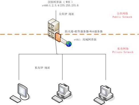 最简单的结构是如下图所描绘的状况,防火墙和邮件服务器安装在同一部机器上。由于防火墙已经配备了NAT,在此状况下,就只需要一个公共IP地址。那些被防火墙防护的PC可以透过DHCP分别获取一个内部私有的IP地址。