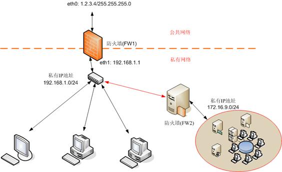 FW2是另一个具有NAT功能的防火墙;它的一边是办公室网络,另一边是实验室网络。FW2“面向”办公室网络,网络192.168.1.0中的任何一台PC都不能察觉到网络172.16.1.0/24。实验室中机器之间的传输将不会穿过FW2,它们都只是待在其子网络中。但当实验室中的人们想要从位于192.168.1.0/24的机器上获取某些数据时,他们仍然可以从实验室中去存取那些在192.168.1.0/24的机器。