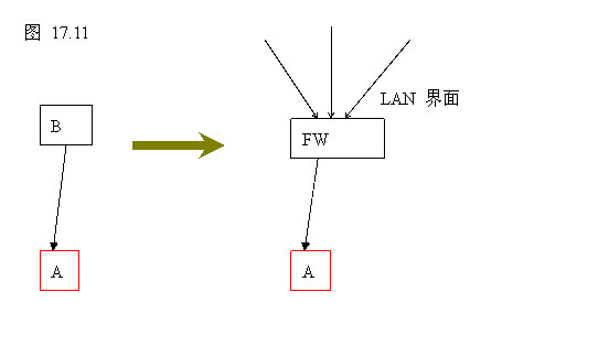 例如,一开始A只听命于B的IP地址发出的请求,所以A只听命于B。当我们想要用更多的机器去共享A,但我们又不想改变A的设计时,我们可以用防火墙设置端口转送,使防火墙的LAN接口使用B的初始的IP地址,并转送某特定端口收到的所有请求给A。