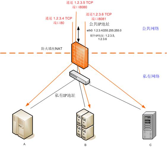如果您拥有若干IP地址,且想要在同一地点设置若干服务器,您可以使用以下架构,来使它们能共享一个防火墙: