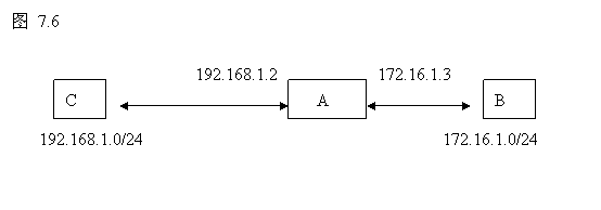 在图表中,机器A拥有两个以太网络界面,IP地址分别是192.168.1.2 和172.16.1.3。它居于网络192.168.1.0/24和172.16.1.0/24之间,拥有将数据封包从一个界面传送到另一个界面的能力。机器B位于网络172.16.1.0/24中,机器C位于网络192.168.1.0/24中。如果B发出一个目的IP地址是C的数据封包,它需要作哪一类的设置才能到达C呢?