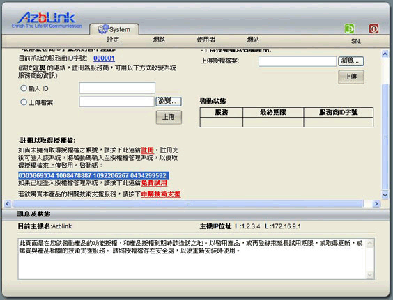 如果您的机器尚未连上网络,请参照【Azblink 系统快速安装】中的快速安装及设定。 将画面中的启动码复制后,按下【注册】按纽,窗口会自动开启【管理系统登入】页面如下: 点选【客户注册】按纽,前往【客户功能支持服务区】填写注册数据后,按下【确认注册】,系统会自动转往登入页面,您就可以使用方才注册的帐号密码,进行登入。 若您是经销商,请点选【经销商注册】,前往【经销商管理系统】进行注册。 登入【客户功能支持服务区】后,点选启动中心 >> 试用启动 ,选择产品名称,把刚才复制的启动码贴入,按下【确认送出】,系统会自动询问是否要开启授权档(.tgz),选择【储存档案】,点选【确定】,将档案储存至您的计算机。 回到系统画面【上传授权文件以启动产品】字段,点选【浏览】选择刚才下载的授权档案(.tgz),按下【上传】, 上传好授权档案之后,您可以按下画面右上方的绿色方块图示注销,便可完整看到您所选择的各项功能,完成产品启动流程。 试用期通常为ㄧ年。 在试用期间,您可设定防火墙 、VPN、备份、电子邮件、网络电话、虚拟主机及DNS服务器等来试用提供的功能。在试用期满后,您可依您的需要,再次造访 http://www.azblink.com 以取得分别功能的使用授权,同样的您必须依照如启用试用的相同步骤,来启用软件的使用授权,如此即完成整个延长试用、取得更新、或申购技术支持的完整程序。